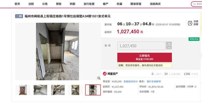 房屋产权面积229.37平米,毛坯性质,上下共三层楼,当下进入到第二次拍卖的阶段,在2026年2月1日开拍,起拍价格102.7万,折算单价4451元/平米,真正成为大家口中的一样,福州的房子,几千块一平米。
